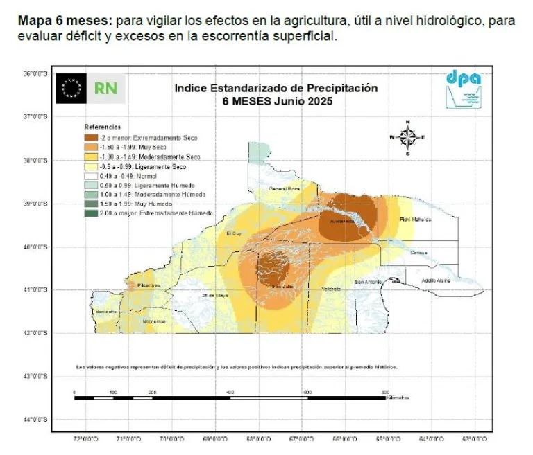 En lo que respecta al resto de la provincia, persiste la sequía en Avellaneda. “Sigue como el núcleo más seco del territorio rionegrino, con un año consecutivo de déficit hídrico extremo”, explicaron desde el Departamento Provincial de Aguas (DPA).