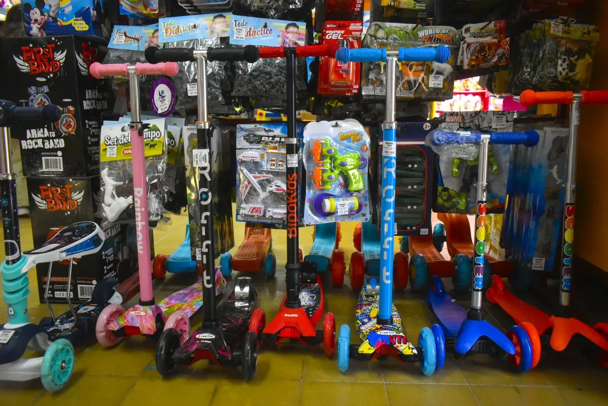 En otro orden, un muñeco "King Kong" en tamaño grande cuesta 99.000, un "Iron Man" medio 15.500, un robot a pila 41.800, animales de la granja a 23.500 y los juegos de mesa en general se ubican entre 50.000  y 70.000 pesos. Como complemento, también hay monopatines chicos para criaturas de corta edad, entre 90.000 y 110.000.