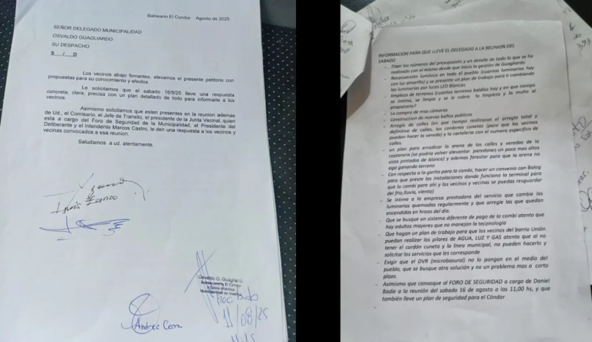 A raíz de esto, desde la junta vecinal firmaron un petitorio que fue entregado al delegado de El Cóndor y Costa Atlántica, Osvaldo Guagliardo. “Tuvimos una reunión inicial, donde estuvo presente el delegado, el comisario, el presidente de la junta, Eduardo Fuente, y los vecinos pudieron hacer sus reclamos”, le contó Adriana Saber a NoticiasNet.