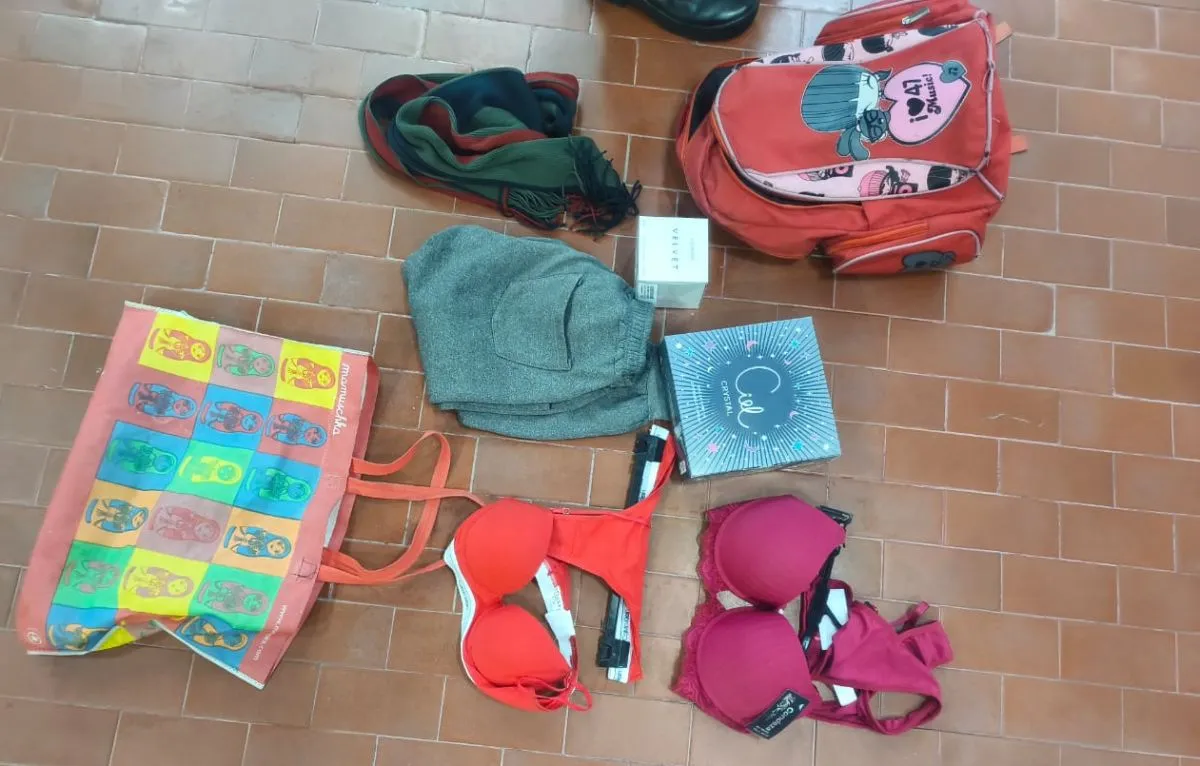 Con la participación de testigos la muchacha exhibió el contenido de los bolsos constatándose el hallazgo de tres envases de perfumes, y dos conjuntos de ropa interior femenina con sus respectivas perchas.