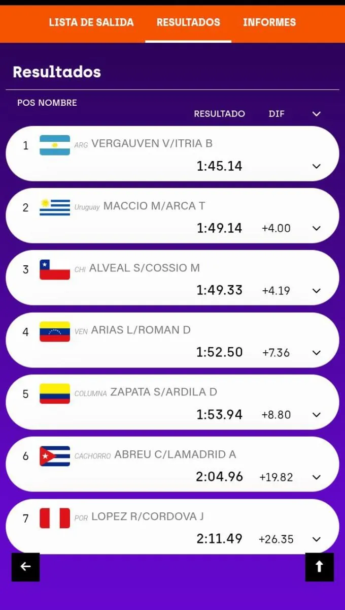 La dupla Vergauven-Itria obtuvo un tiempo de 1:45.14, por encima de los uruguayos Maccio y Arca que terminaron con 1:49.14. El podio lo completaron los chilenos Alveal y Cossio con 1:49.33.