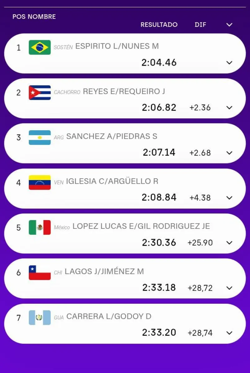 La dupla brasileña de Mateus Nunes y Espirito fue la ganadora con 2:04.46, los cubanos Reyes y Requeiro ganaron la plateaa con 2:06.82 y mientras que Aramís y su compañero hicieron un tiempo de 2:07.14.