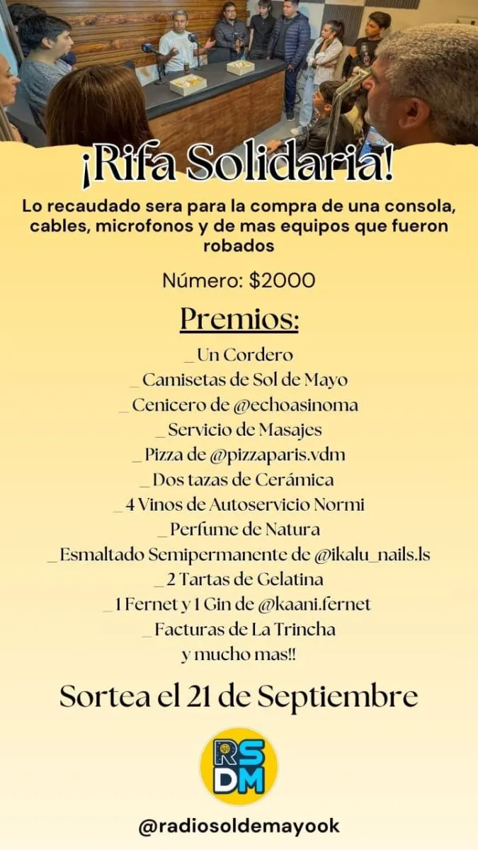 Tras el devastador robo sufrido en Radio Sol de Mayo (95.1), los damnificados lanzaron una rifa solidaria con el objetivo de recaudar fondos y lograr el propósito de reponer los equipos técnicos que fueron sustraídos.