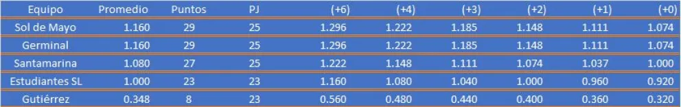 Si gana uno y empata otro (+4pts): Se salva, podría ser alcanzado si Santamarina gana los dos, pero no por Estudiantes de San Luis.