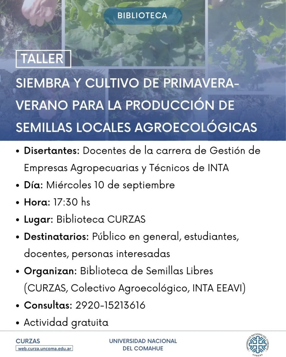 El taller será dictado por docentes de la carrera de Gestión de Empresas Agropecuarias y técnicos del INTA, quienes compartirán saberes y herramientas para producir semillas de manera local y sustentable. La capacitación forma parte del trabajo que impulsa la Biblioteca de Semillas Libres, una iniciativa conjunta del Curzas, el Colectivo Agroecológico y el Instituto Nacional de Tecnología Agropecuaria (INTA) y sus diversas Estaciones Experimentales Agropecuarias (EEA).