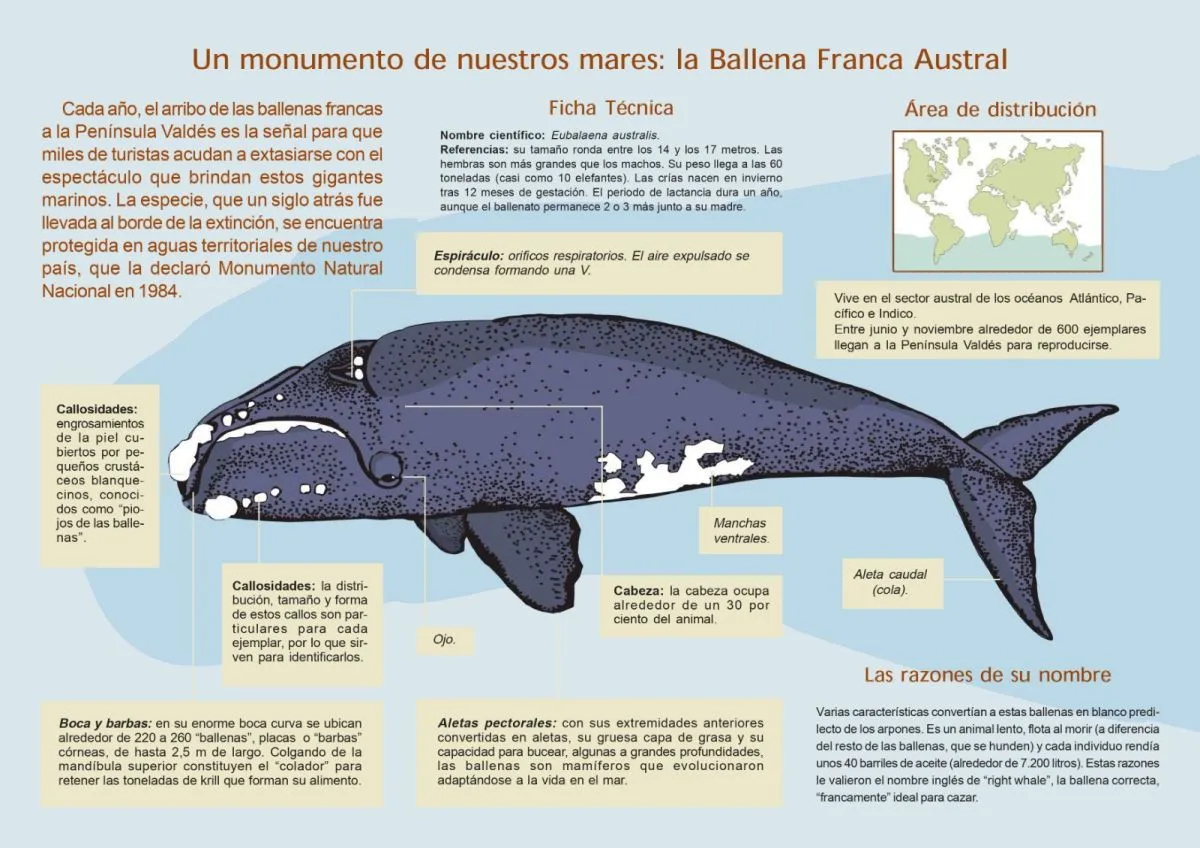 La ballena franca austral es una especie que habita el océano Atlántico, Pacífico e Índico. Las hembras, que pueden medir hasta 17 metros y pesar cerca de 60 toneladas, llegan a estas costas con sus crías para completar el ciclo de reproducción y crianza. Las crías nacen tras 12 meses de gestación, en pleno invierno, y permanecen junto a sus madres durante dos o tres años.