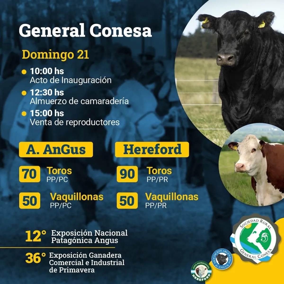 La jornada prevé la venta de 70 toros de Puro de Pedigrí y Puro Controlado y 50 vaquillonas de la raza Angus. Mientras que también se comercializarán 90 toros de Puro de Pedigrí y Puro Registado y 50 vaquillonas de Hereford.