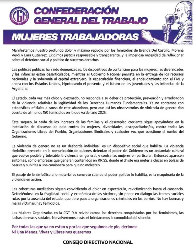 La Confederación concluye reafirmándose en su lucha por los derechos obtenidos por el feminismo y las fuerzas laborales, reiterando que no se retrocederá ni se silenciará, demandando justicia bajo el enérgico lema: "Ni Una Menos. Vivas y Libres nos queremos".