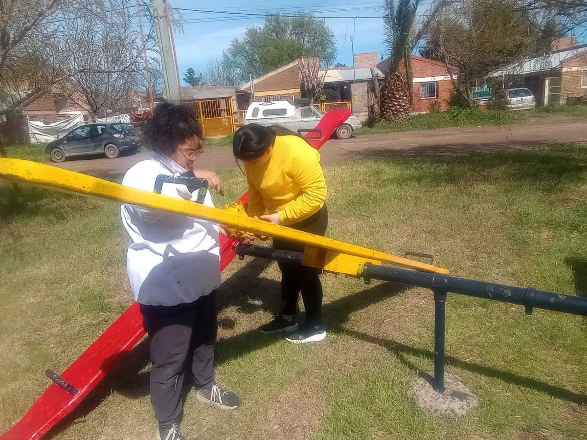 Un grupo de vecinos de El Cóndor estuvo trabajando el fin de semana en la plaza ubicada en ingreso a la villa balnearia, pintando los juegos de los chicos. Participaron desde la junta vecinal y también personas de la Iglesia de Jesucristo.
