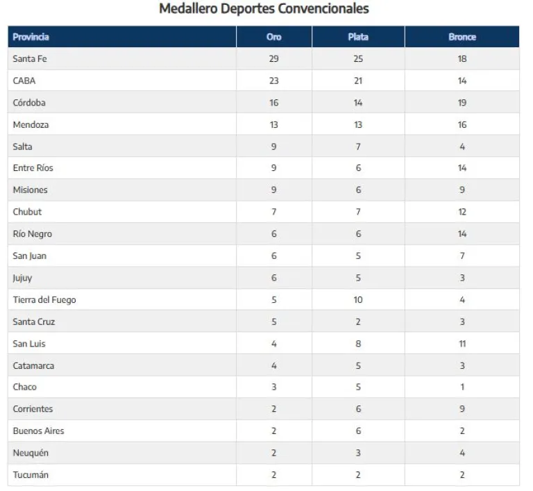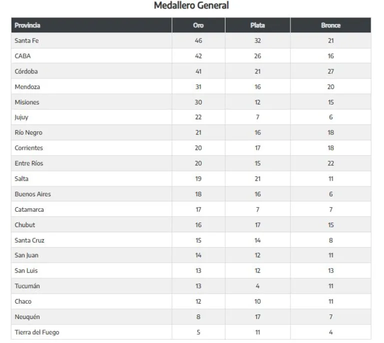 El ganador del medallero general fue Santa Fe, quienes sumaron 46 medallas de oro, 32 de plata y 21 de bronce, seguido por CABA con 42 oro, 26 plata y 16 bronce, mientras que Córdoba completó el podio con 41 oro, 21 plata y 27 bronce. En los primeros lugares también aparecen Mendoza (4°), Misiones (5°) y Jujuy (6°).