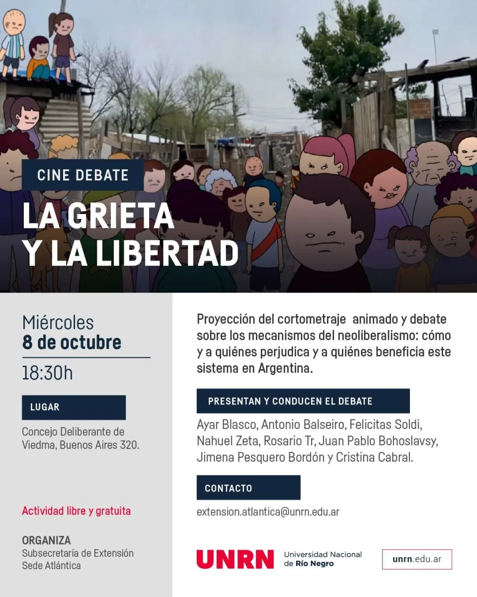 Este miércoles 8 de octubre a las 18.30 hs, se proyectará en el Concejo Deliberante de Viedma el cortometraje animado “La Grieta y la Libertad”, una producción audiovisual que invita a reflexionar sobre las consecuencias del neoliberalismo en Argentina y su impacto en los derechos humanos. Tras la función, se abrirá un espacio de debate con la participación de sus realizadores.