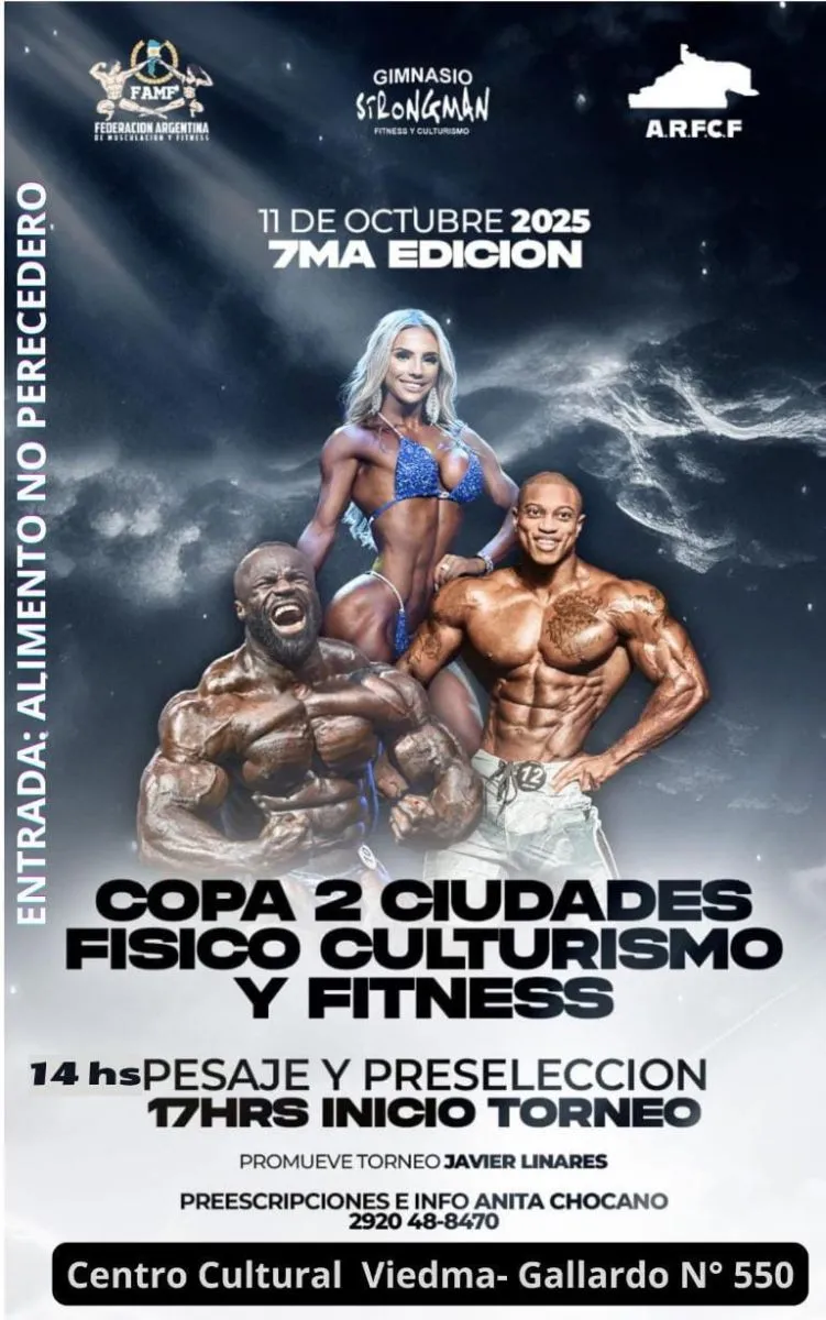 El próximo sábado 11 de octubre, en el Centro Cultural de Viedma, se disputará la séptima edición de la Copa Dos Ciudades de Físico Culturismo y Fitness, con una gran expectativa por los representantes locales y con una nutrida delegación de deportistas que arribarán a la capital rionegrina desde distintos puntos de la Patagonia.