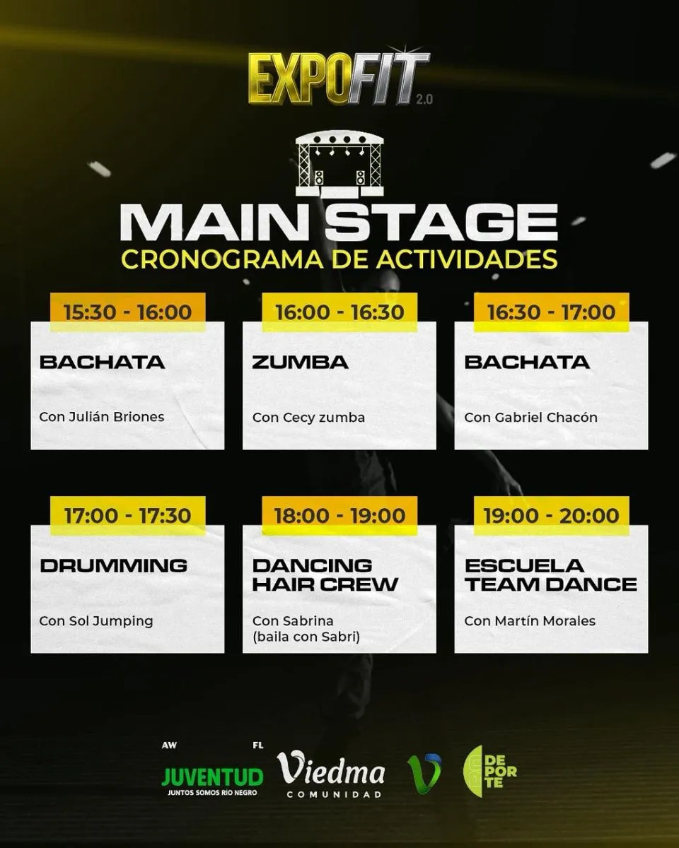 A su vez, la jornada contará con un escenario principal donde se brindarán clases de Stretching, movilidad y flexibilidad, GAP, Fitness e iniciación al running, aerobox, Kangoo jumping, bachata, zumba, drumming, y clases de baile.