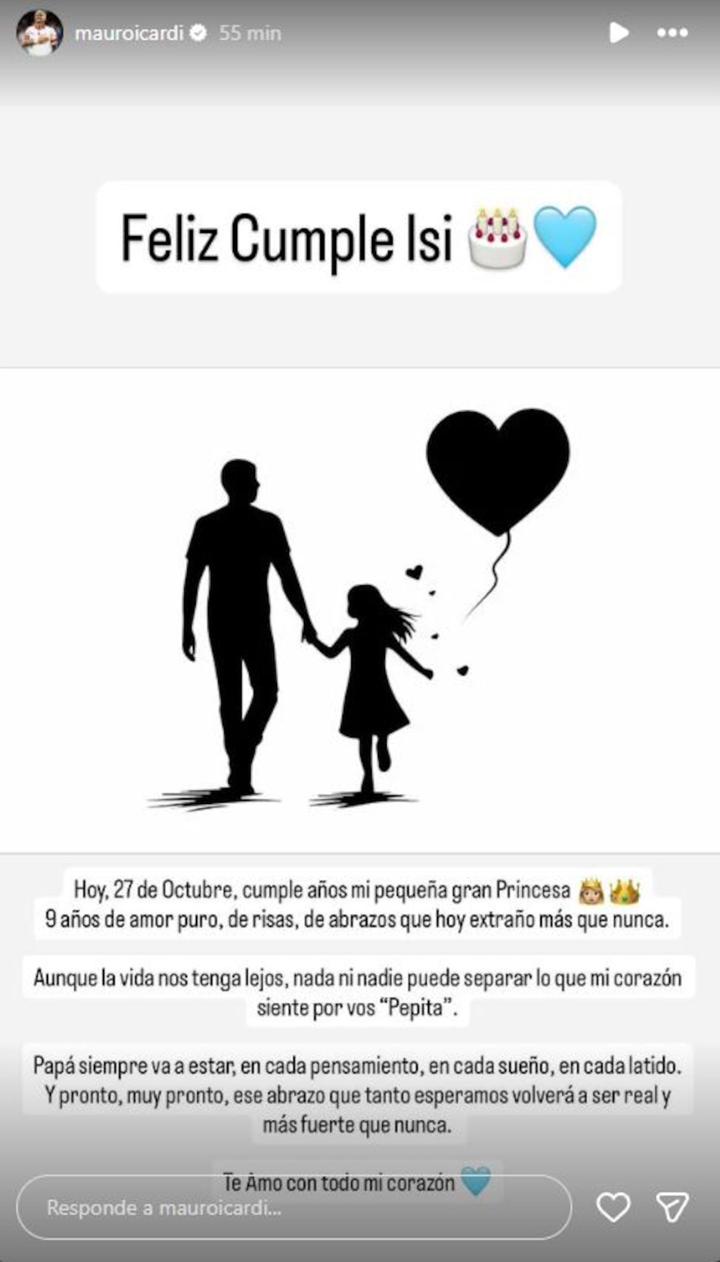 “Feliz cumple Isi. Hoy, 27 de octubre, cumple años mi pequeña gran Princesa. Nueve años de amor puro, de risas, de abrazos que hoy extraño más que nunca”, escribió en sus historias de Instagram.