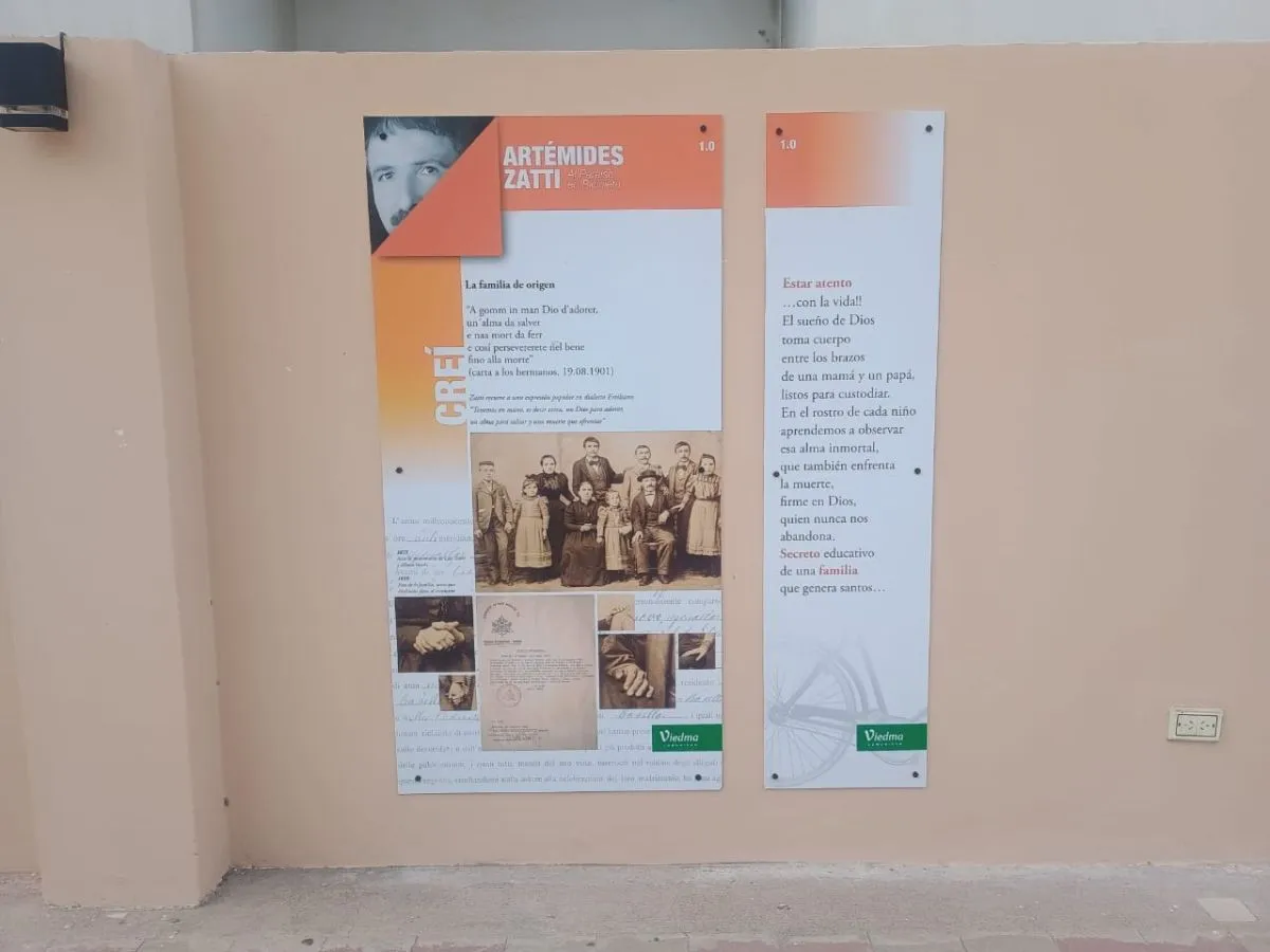 Los Paneles de vida y obra de San Artémides Zatti son réplicas de los instalados en la Basílica del Sagrado Corazón de Jesús en Roma, sede de la congregación salesiana. La exposición fue encargada, diseñada y cedida por al municipio por la Inspectoría Salesiana de Lombardía-Emilia, Italia.