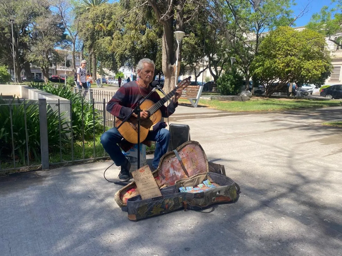 Costa haciendo de las suyas con su guitarra, en la Plaza Alsina (Foto: Vanesa Schwemmler)