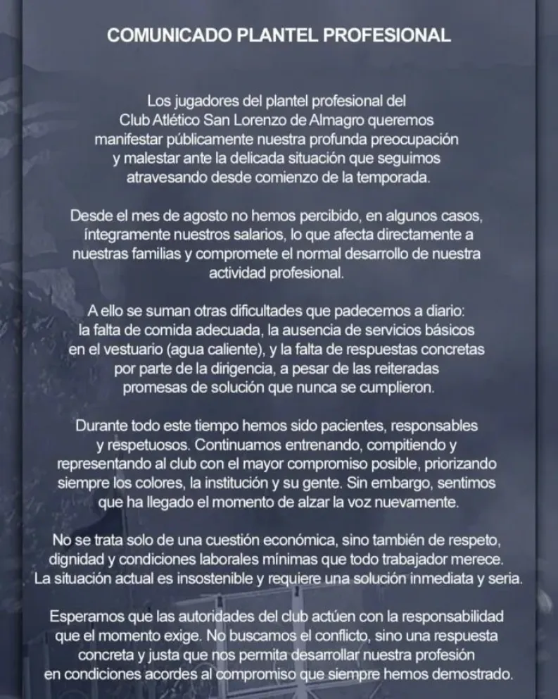 Los jugadores de San Lorenzo publicaron un duro comunicado exponiendo su situación salarial