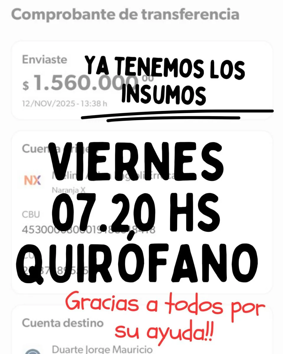 A raíz de eso, tuvieron que juntar 1.6 millones de pesos para que se pueda operar de urgencia. Sin los recursos para juntarlos en la inmediatez, se lanzó una campaña solidaria que fue exitosa. En pocos días se llegó, el jueves 13 compraron los insumos, y este viernes 14 entró al quirófano.