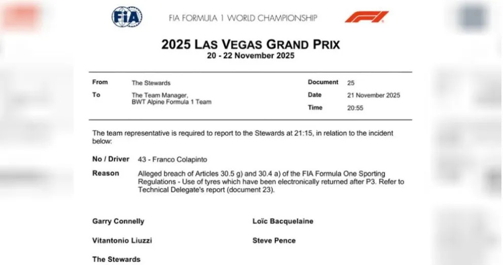 En el marco del Gran Premio de Las Vegas, el piloto argentino Franco Colapinto, quien compite para el equipo Alpine, ha sido objeto de una investigación por parte de los comisarios deportivos de la Federación Internacional del Automóvil (FIA).