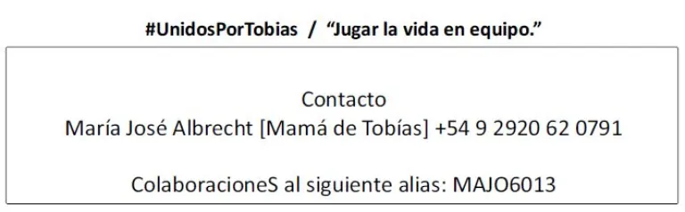 Para conocer detalles se pueden contactar con el club o bien con su mamá, María José Albrecht al: 2920-620791. Más allá de la rifa, también se pueden hacer donaciones e cualquier monto al alias que está a su nombre: majo6013