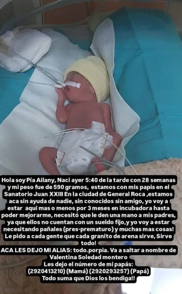 Además, la joven pareja señaló que la beba necesitará insumos específicos, entre ellos pañales para prematuros, además de otros elementos indispensables durante el tiempo de internación. Para quienes puedan aportar, informaron que reciben contribuciones a través del alias TODO.PORPIA. a nombre de Valentina Soledad Montero.