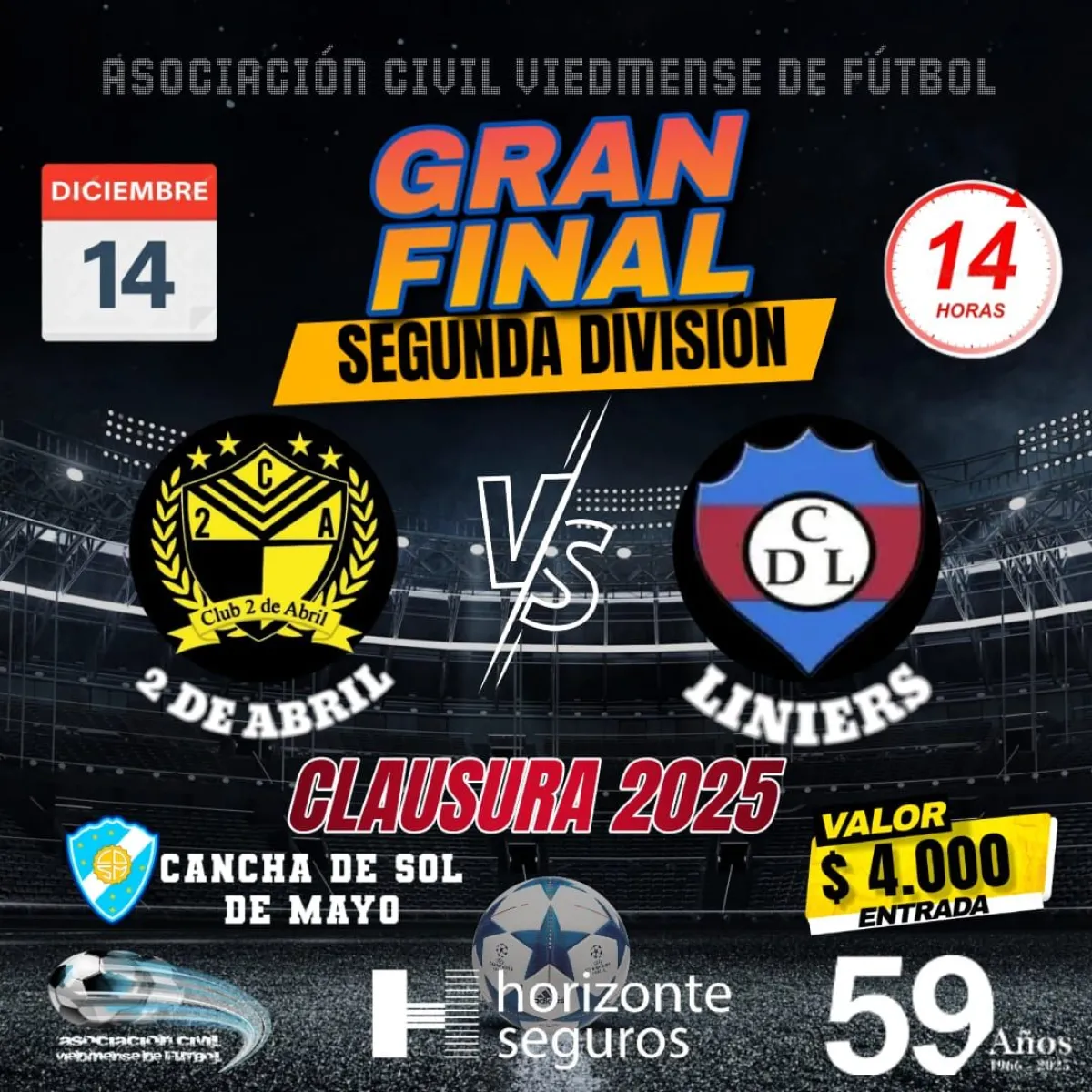 La acción comenzará a las 14 con la definición de la categoría Reserva, donde 2 de Abril y Liniers buscarán cerrar el año con el título. Ambos equipos llegan con campañas sólidas y un recorrido que los llevó a convertirse en protagonistas, por lo que se espera un duelo parejo y cargado de intensidad en un verdadero clásico de barrio.