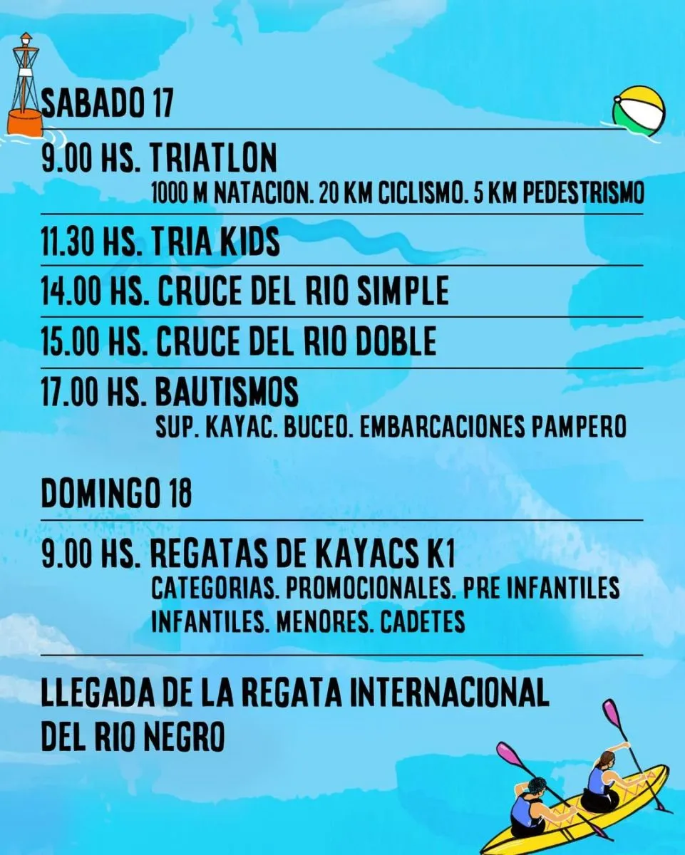 Durante la tarde del sábado se realizarán el Cruce del Río simple (14) y el Cruce del Río doble (15), y a partir de las 17 habrá bautismos deportivos con actividades como SUP, kayak, buceo, pampero y salvamento deportivo. El cronograma continuará el domingo 18 de enero, desde las 9, con la Regata de Kayaks K1.
