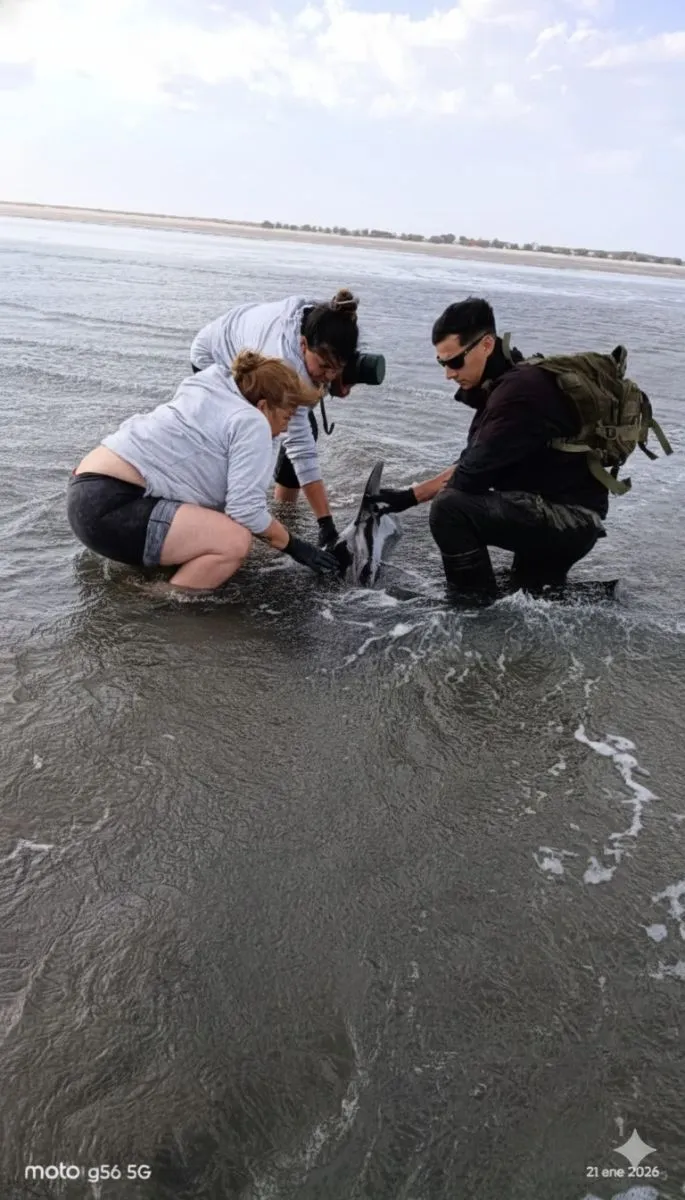 Gracias al accionar responsable de los visitantes, el delfín pudo ser devuelto al mar. Sin embargo, poco después volvió a encallar frente a la playa de Pescadores, donde intervino el equipo de rescate provincial. Tras varios minutos de trabajo, masajes y maniobras de reanimación, lograron reintroducirlo nuevamente al agua.