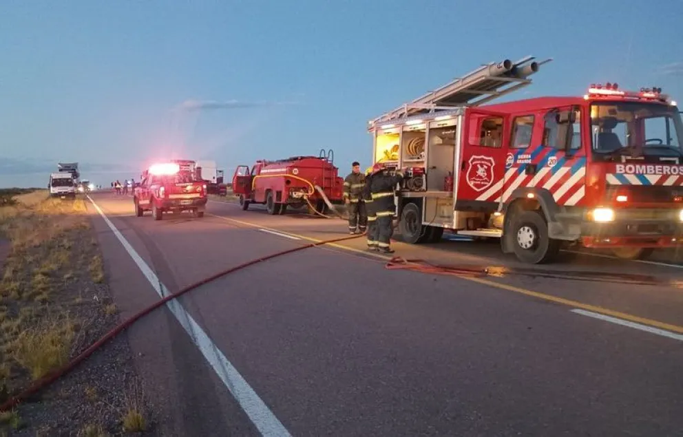 El siniestro ocurrió en la Ruta Nacional Nº 3, a unos 30 kilómetros al sur de Sierra Grande, lo que generó un importante despliegue de dotaciones de bomberos de esa ciudad, y de acuerdo a algunos trascendidos, se requirió la presencia de 13 rescatistas para apagar las llamas.