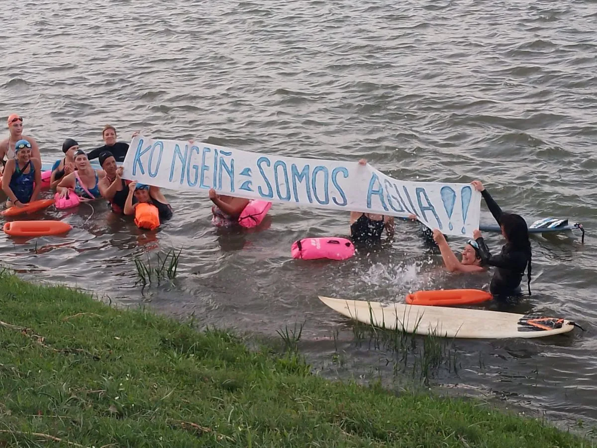 Desde este punto emblemático, una nutrida columna de mujeres recorrió las calles de la ciudad, finalizando su trayecto en la costanera de la capital rionegrina. Allí, se unieron a un grupo de nadadoras que, como parte de una acción colectiva, expresaron su defensa del agua y su importancia vital para la vida.