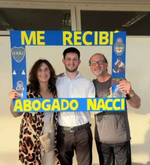 Enzo Nacci y el orgullo de sus padres tras recibirse como abogado.