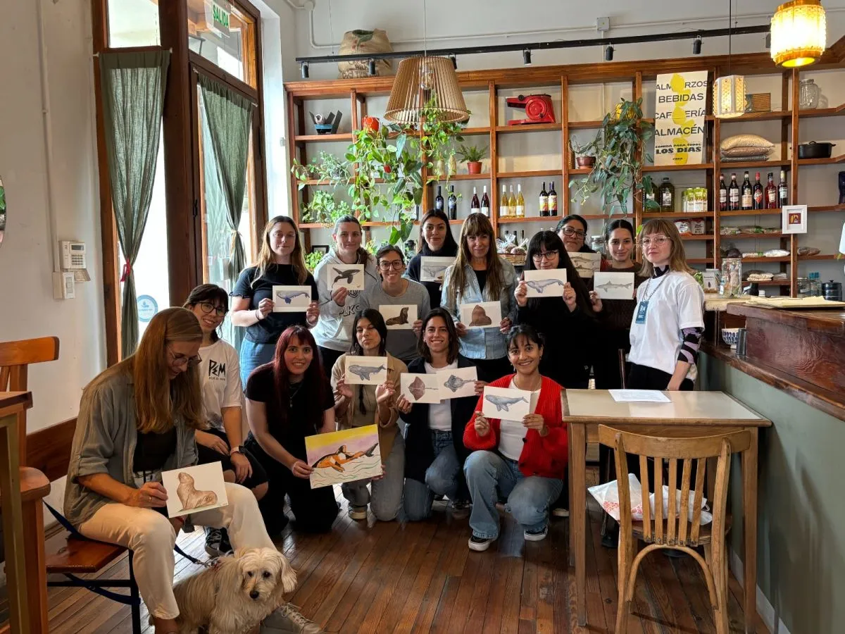El encuentro se desarrolló junto a la artista y docente Agustina Acheritobehere, quien coordinó un espacio de dibujo centrado en las especies emblemáticas: ballenas, delfines, tiburones, orcas y lobos marinos. A lo largo de la jornada, los participantes no solo experimentaron con técnicas artísticas, sino que también pudieron conocer las características, hábitats y el rol ecológico de estas especies en el Golfo San Matías.