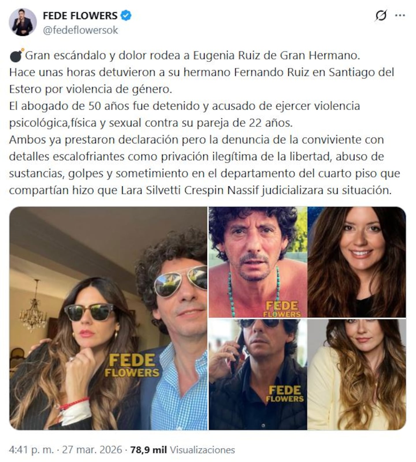 El arresto de Fernando Ruiz, hermano de Eugenia, no pasó desapercibido ya que las acusaciones de ejercer violencia de género hicieron eco rápidamente en las redes sociales y medios de comunicación. La información fue difundida inicialmente con un mensaje que estremeció al entorno cercano de Eugenia, así como al público en general: "En Santiago del Estero detuvieron a Fernando Ruiz por cargos de violencia psicológica, física y sexual contra su pareja de 22 años. Sin embargo, el caso no termina ahí y lo peor parece que aún está por venir."