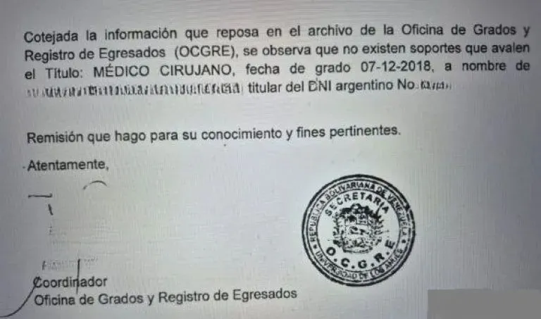 La respuesta de las autoridades universitarias venezolanas no se hizo esperar. Según el documento al que accedió ese medio, el secretario de la Universidad de Los Andes explicó que los folios del título no coinciden con los registros oficiales de 2018. Ese año se recibieron 126 médicos cirujanos, pero la numeración del diploma presentado no corresponde.