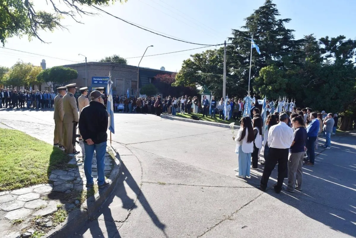 La ceremonia, desarrollada en la plazoleta de Boulevard Arró, estuvo presidida por el titular del Honorable Consejo Deliberante, Amílcar Safe, quien estuvo acompañado por el Coordinador de Políticas Públicas, Cristian Duarte - en representación del Intendente Ricardo Marino -, además de concejales, autoridades educativas, de seguridad y un nutrido grupo de vecinos que se acercó a rendir honores.