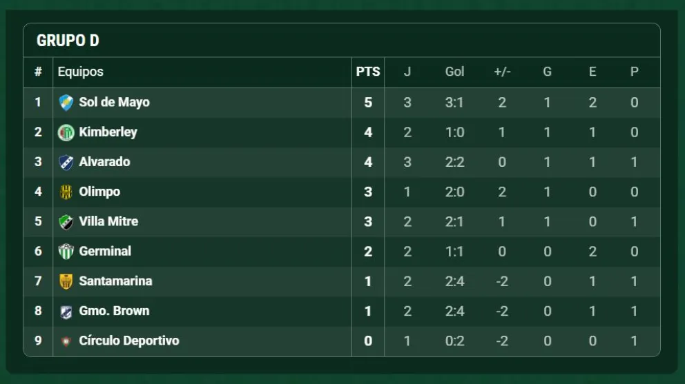 Por otro lado, Olimpo de Bahía Blanca, que suma 3 puntos, tiene la oportunidad de alcanzar la cima y compartir el liderazgo con el equipo de Viedma en caso de imponerse en su visita a Guillermo Brown en Puerto Madryn.