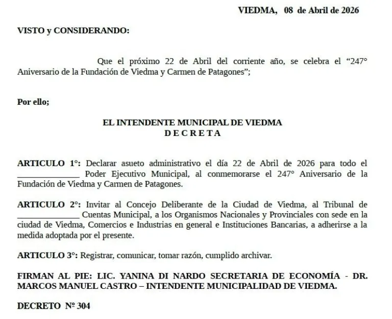 El intendente de Viedma Marcos Castro, firmó el pasado 8 de abril un decreto mediante el cual se establece asueto administrativo para el día 22 de abril de 2026, en el ámbito del Poder Ejecutivo Municipal.