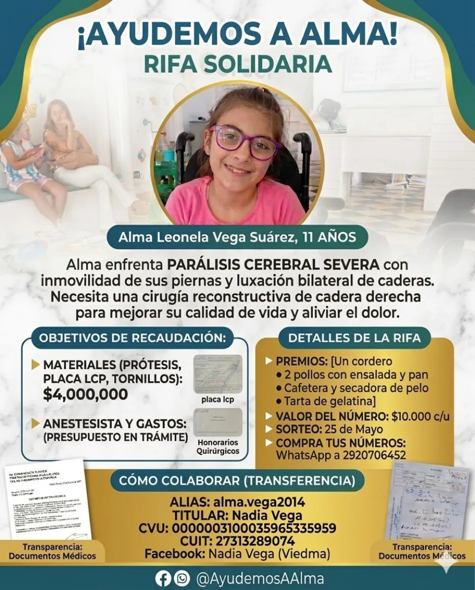 Una campaña solidaria se puso en marcha para ayudar a Alma Leonela Vega Suárez, una niña de 11 años que padece parálisis cerebral severa y necesita someterse a una compleja cirugía de cadera para mejorar su calidad de vida y aliviar el dolor que sufre a diario.