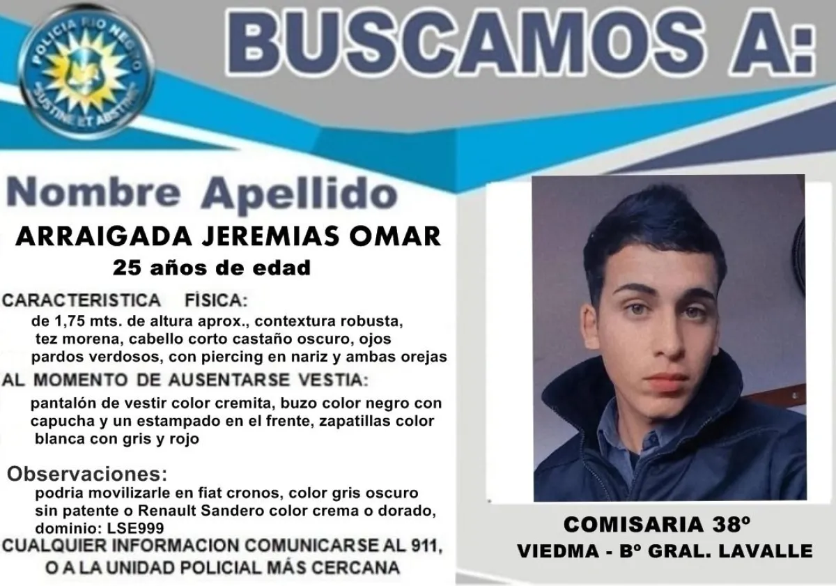 Se trata de Jeremías Omar Arraigada, quien presenta una contextura robusta, mide aproximadamente 1,75 metros, tiene tez morena, cabello corto castaño oscuro y ojos pardos verdosos. Como dato distintivo, posee piercing en la nariz y en ambas orejas. La denuncia fue hecha por la madre del muchacho anoche en sede la Unidad 38 del barrio Lavalle y agregó que su hijo tenía licencia psicológica.