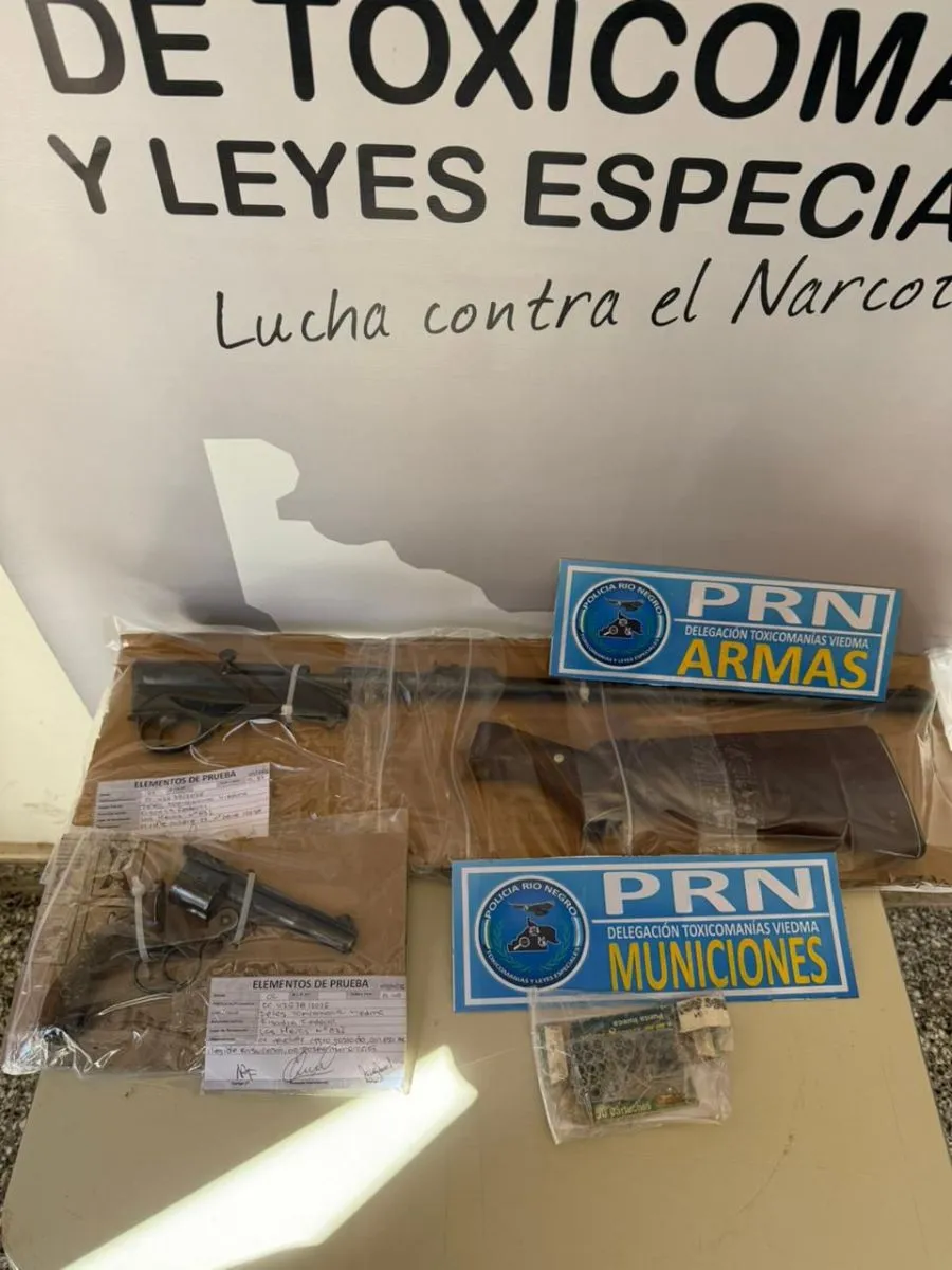 Un llamado anónimo al 0800-DROGAS puso en marcha una investigación que, tras un mes de tareas de inteligencia, terminó con un allanamiento en Viedma donde se secuestraron dos armas de fuego, 19 municiones y diversos elementos vinculados al cultivo de cannabis sativa.