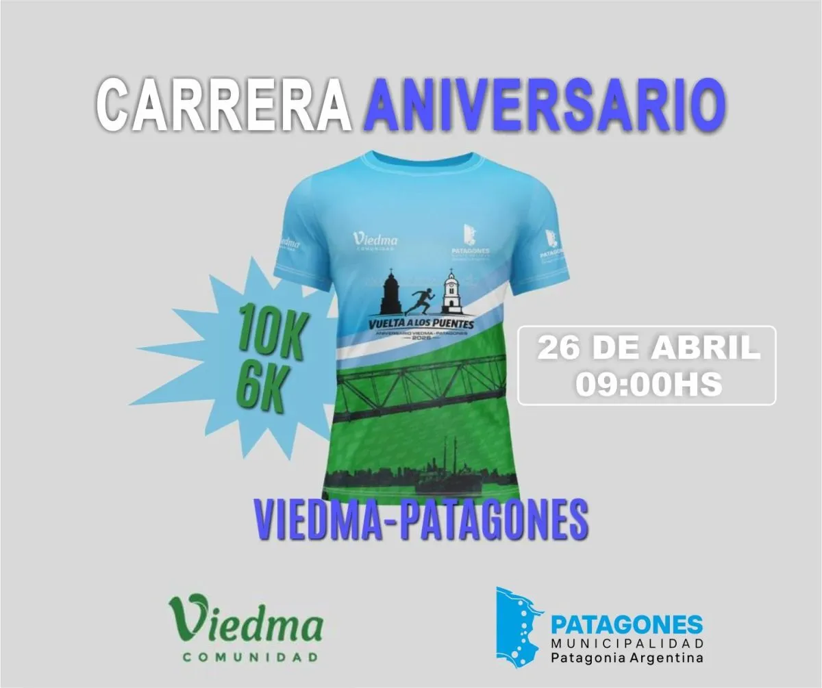 La competencia se llevará a cabo el domingo 26 de abril, con largada principal a las 9 desde la Plaza 7 de Marzo, en Patagones, y llegada en la pista de atletismo de Viedma. El circuito unirá puntos emblemáticos de ambas ciudades en una jornada que promete convocar a corredores y público.
