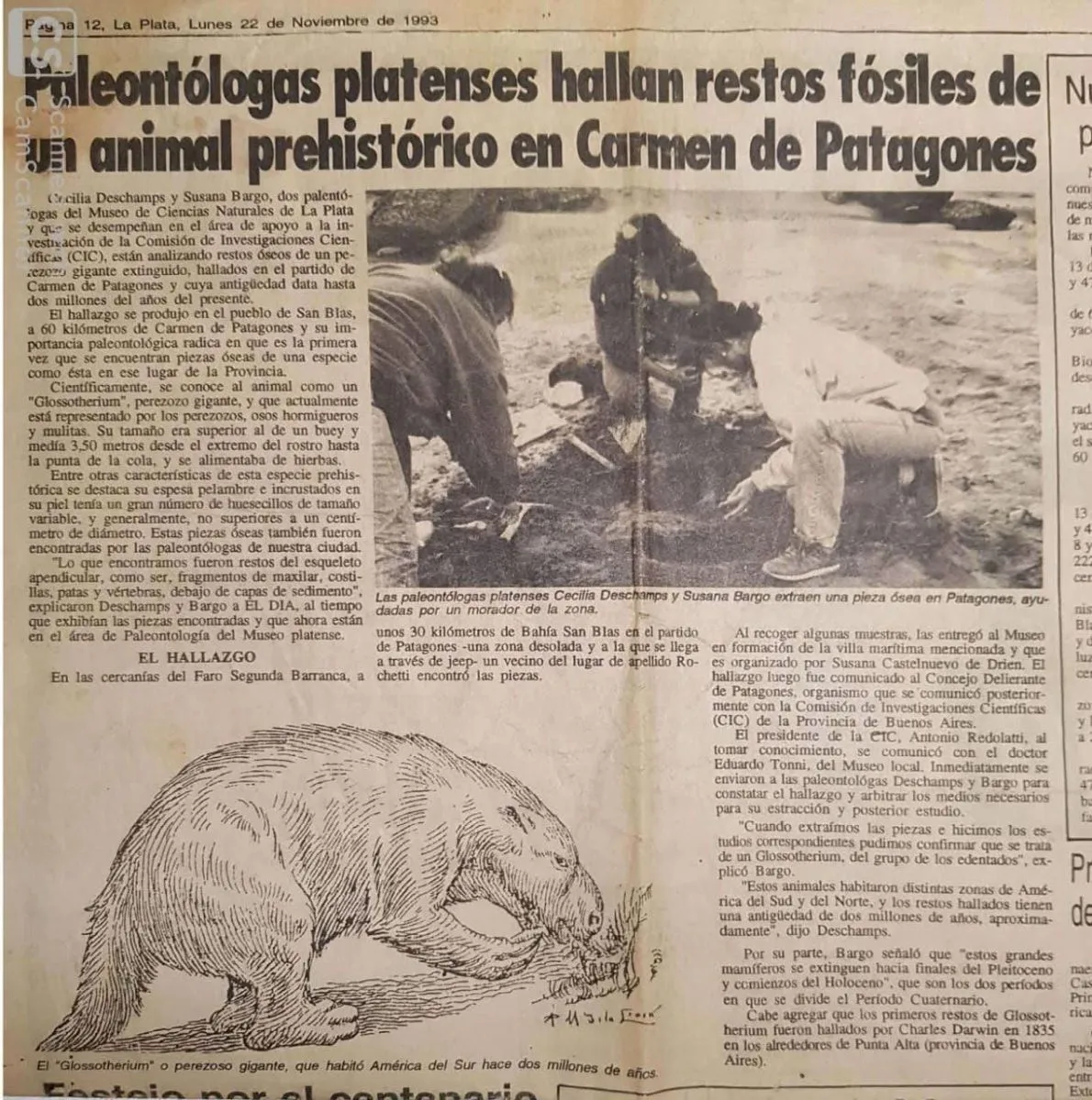 Las crónicas de la época señalaron que las paleontólogas Cecilia Deschamps y Susana Bargo, investigadoras del Museo de Ciencias Naturales de La Plata, fueron quienes analizaron los restos fósiles de un Glossotherium, un perezoso gigante extinguido que habitó el continente hace aproximadamente dos millones de años.
