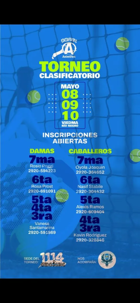 La capital rionegrina recibirá del 8 al 10 de mayo el primer Torneo Clasificatorio Provincial de Pádel, un certamen que reunirá a 183 parejas de distintos puntos de la provincia. La competencia se desarrollará en el complejo 1114 y marcará el inicio del camino rumbo al Campeonato Nacional.
