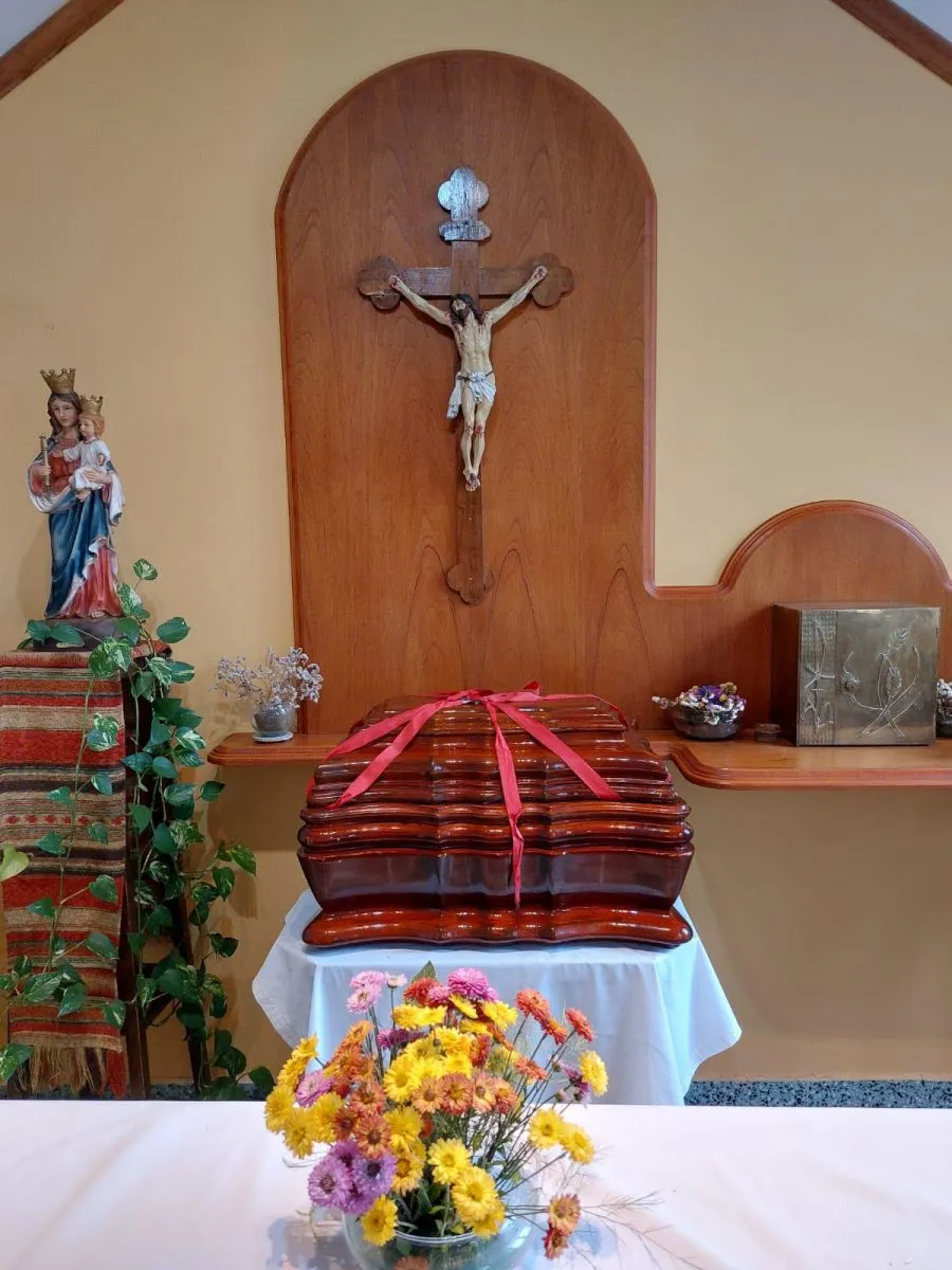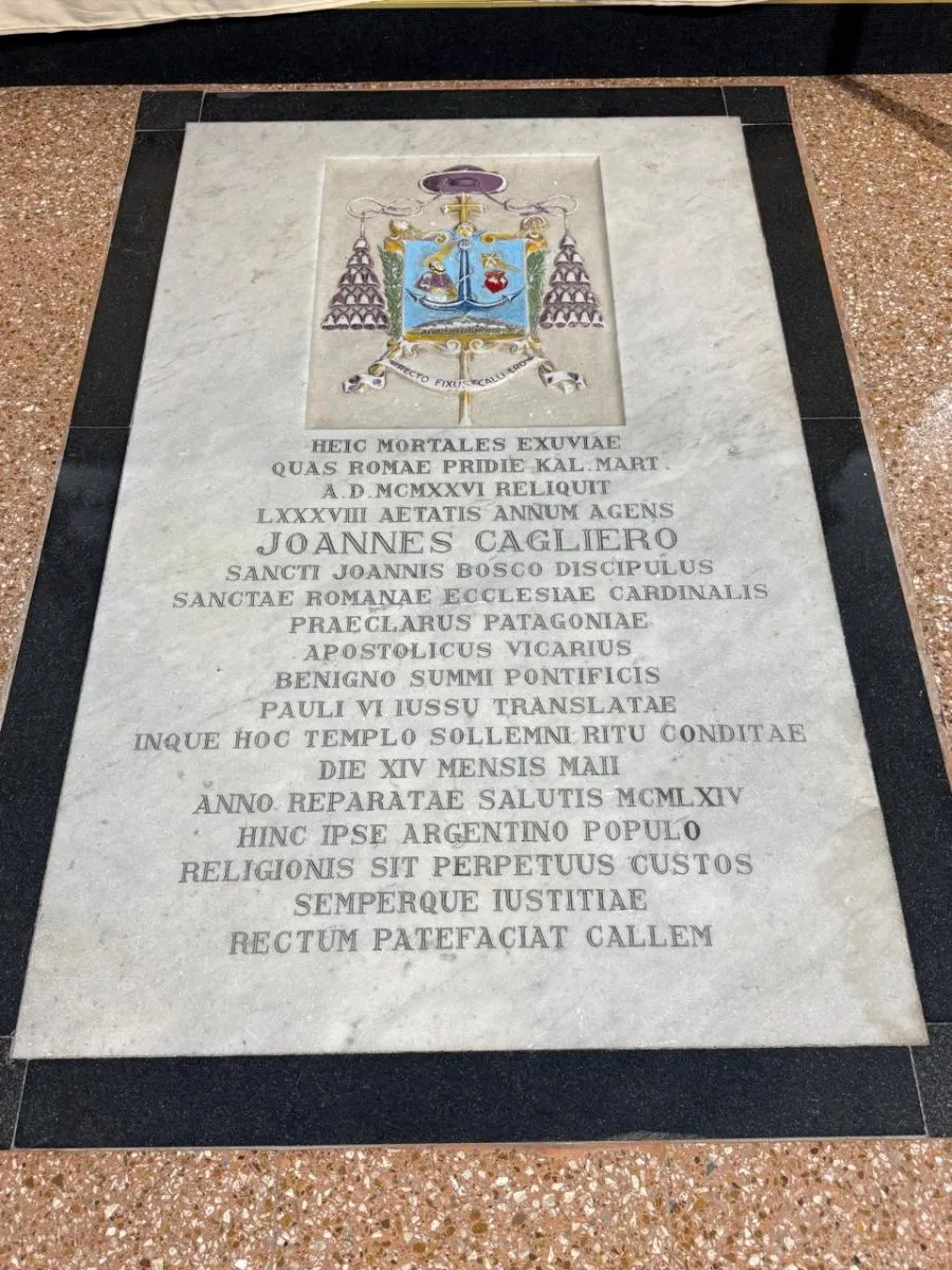 Su lápida, que está en el centro de la iglesia y está escrita en latín, recuerda a uno de los hombres más influyentes en la evangelización del sur argentino. Traducida, destaca que allí reposan sus restos, traídos desde Roma en 1964, y lo define como un “ilustre de la Patagonia”, discípulo de Don Bosco y primer vicario apostólico de la región.