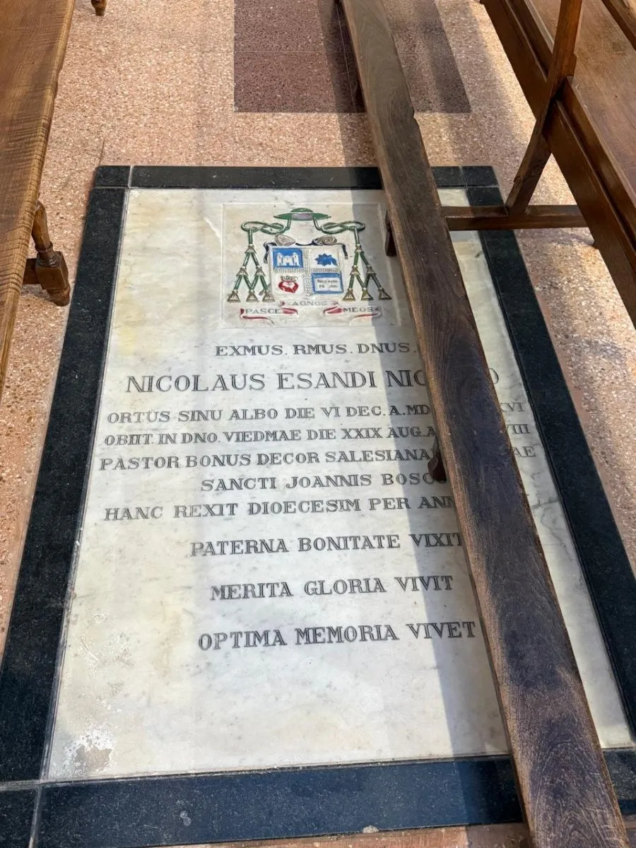 A pocos metros, la lápida de Nicolás Esandi también está en latín y lo describe como un “buen pastor” de la diócesis de Viedma. La inscripción subraya valores como la bondad, la cercanía y el servicio paternal. No son palabras elegidas al azar: Esandi fue recordado justamente por su vínculo directo con la gente y su estilo pastoral sencillo.