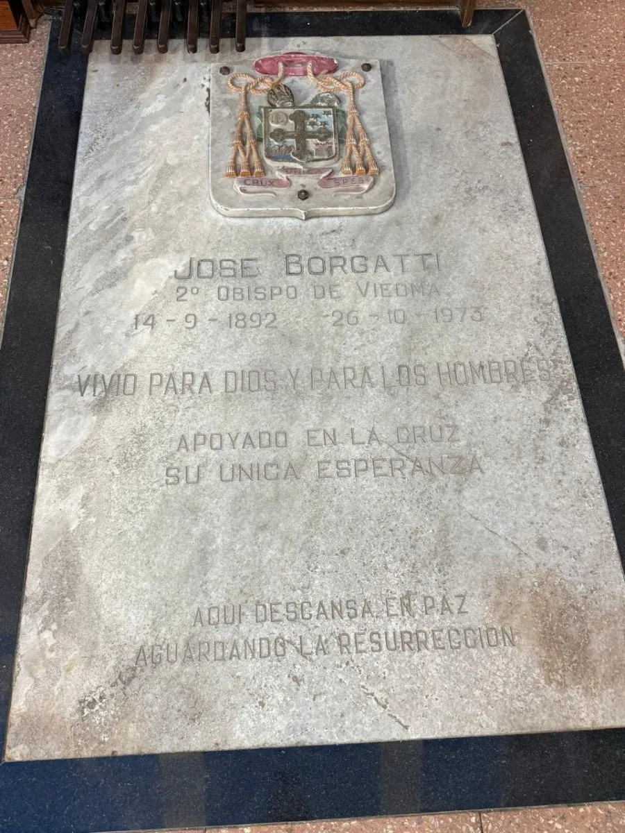 Quien entra a la Catedral de Viedma suele mirar hacia arriba: vitrales, arquitectura, historia viva. Pero pocos reparan en lo que está más cerca de lo cotidiano: el suelo. Allí, casi desapercibidas, tres lápidas guardan la memoria de figuras fundamentales para la región. Se trata del cardenal Juan Cagliero, el obispo Nicolás Esandi y el monseñor José Borgatti.